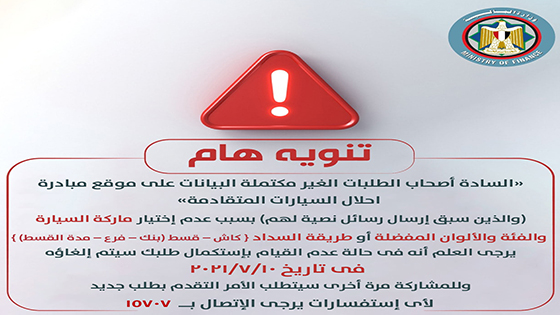 من خلال الصفحة الرسمية على فيسبوك لمبادرة تحويل وإحلال المركبات للعمل بالطاقة النظيفة، تم الإعلان عن تنويه هام جدا لجميع المشاركين بالمبادرة، حيث كان هذا التنويه موجه للمشتركين الذين لم يتم استكمال طلباتهم، ونبهت المبادرة هؤلاء المشتركين بأن طلباتهم قد يتم الغائها خلال أيام بسبب هذا الأمر، حيث تم نشر هذا التنبيه كالتالي: