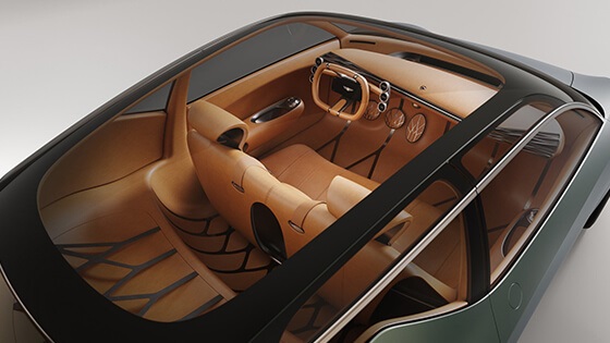 ومن الداخل فتم تصميم النموذج بشكل أنيق وفخم وغير تقليدي، حيث لم تحمل لوحة القيادة سوى عجلة القيادة ووسطها شاشة صغيرة باللمس لعرض البيانات وتشغيل أنظمة السيارة، كما حمل النموذج دواسات أسفل عجلة القيادة ظهرت أيضا بشكل جذاب وغير تقليدي.
