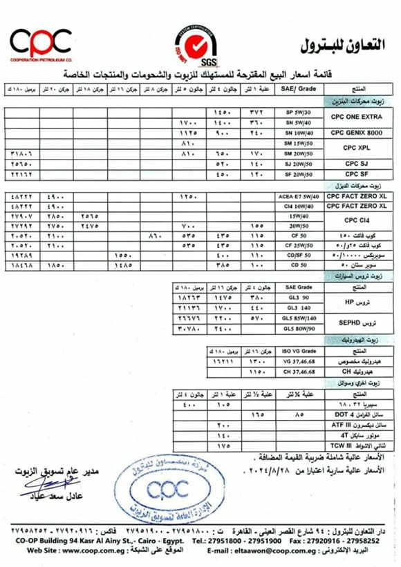 شهدت الأيام القليلة الماضية إعلان شركة التعاون للبترول عن قائمة جديدة بأسعار زيوت السيارات، وذلك بمختلف أنواعها المتواجدة في السوق المصري، حيث كانت هذه القائمة كالتالي: