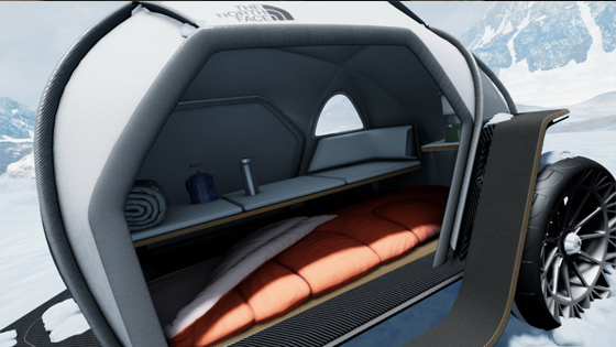 وتم تصميم النموذج على شكل كروي، وهو مزود بمحور عجلات خلفي وجزء أمامي لتثبيته على الأرض، وهو أيضا الجزء الذي يتم ربطه بالسيارة، ويضم النموذج من الداخل مكان للجلوس يمكن استخدامه أيضا كمنضدة، وكذلك يمكن طيه عند الحاجة لتوفير مساحة داخلية أكبر، كما يوجد بأرضية النموذج مكان مخصص للنوم.