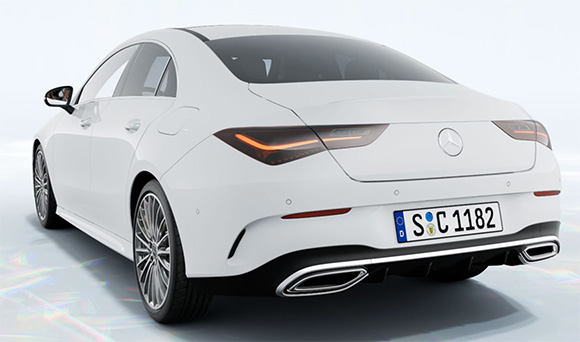 وتحافظ CLA على تصميمها الانسيابي والجريء مع سقف كوبيه منخفض وانسياب خطوط السيارة نحو الخلف، كما تبرز النجمة الكبيرة في الشبك الأمامي مع مصابيح LED أمامية وخلفية محسّنة.