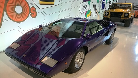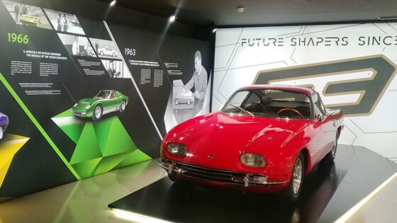 ومع عدم الدخول فى المواصفات الفنية لكل سيارة معروضة بالمتحف وتاريخها الحافل – وهو ما يلزم منا مجلد كامل – إلا أننا سنكتفى هنا بإستعراض بعض الملامح الجاذبة لزائر هذه المتحف الأسطورى ، فالبداية تكون بإستقبالك أولى سيارات لامبورجينى (350GT) والتى أطلقت رسمياً عام 1964 بعد إنشاء مصنع الشركة والتى كانت العنوان الذى أراد معه مؤسس الشركة "فيروتشيو لامبورجينى" من أن يوصل رؤيته عن صناعة السيارات الرياضية للعالم أجمع.