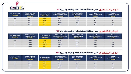 جدير بالذكر أن الجدول أشار أيضا إلى تكلفة تحويل سيارات الوقود العادي إلى سيارات تعمل بالغاز الطبيعي، وهي تكلفة ثابتة تبلغ 7500 جنيه، كما اشار الجدول إلى أن التوفير في مصاريف البنزين سيجعل العميل يسترد قيمة تحويل سيارته للعمل بالغاز الطبيعي تدريجيا، وذلك خلال أشهر قليلة جدا.